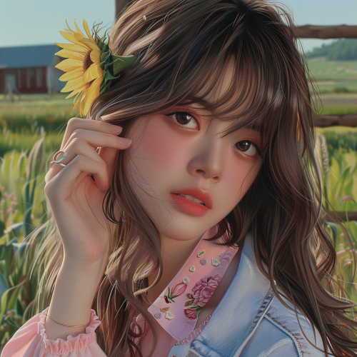A realistic portrait of an anime-style Asian american with brown wavy hair and striking grey eyes. She has a side fringe and long hair flowing down her shoulders with a pink flower in her hair. The girl is wearing a fuscia blouse with pink details and a casual white denim jacket. Her expression is contemplative as she gazes off to the side with sunflower in her hand touching her face .In the background, there’s a pastoral scene with green grass, a wooden fence, and a small fence and a small farmhouse. The image has a vibrant but soft color palette,with a focus on the girl in the foreground.