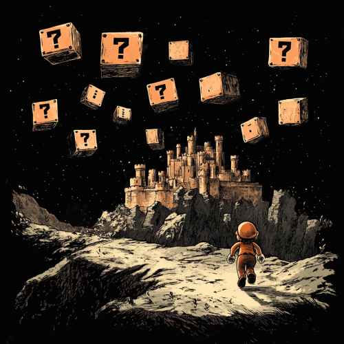 super mario , 70s dark fantasy hand drawn style, with Mario walking to Bowser's castle in distance, question mark blocks and brown brick blocks floating in the air, black background, suitable for tshirt graphic, vintage colours