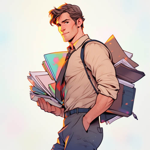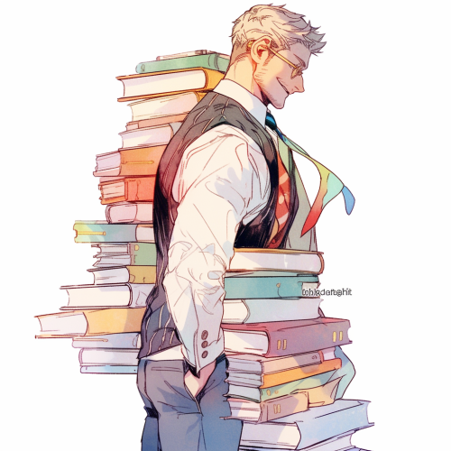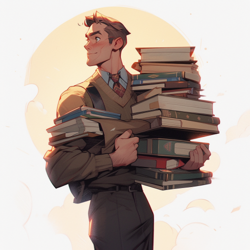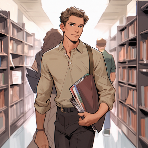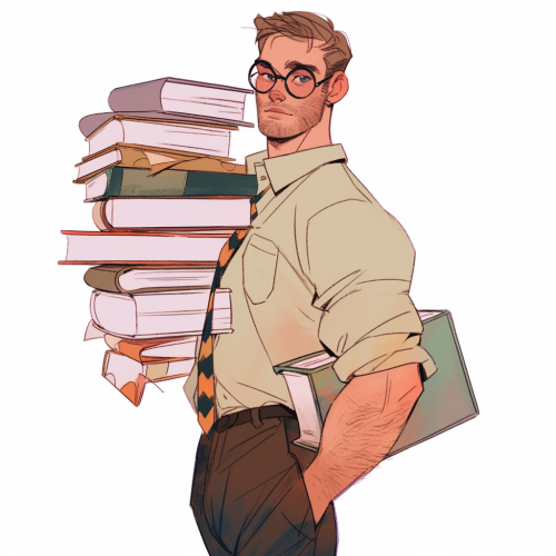 ?️?, rough colored pencils sketch, gay male college professor in the school library, he's carrying a few books, inspired by willem dafoe and tom daley and richard madden, style of zach lynch, wally wood, jc leyendecker, leonid afremov --niji 5 --style cute
