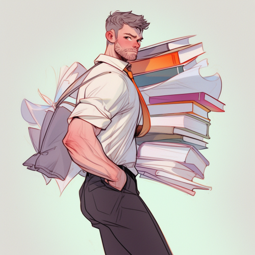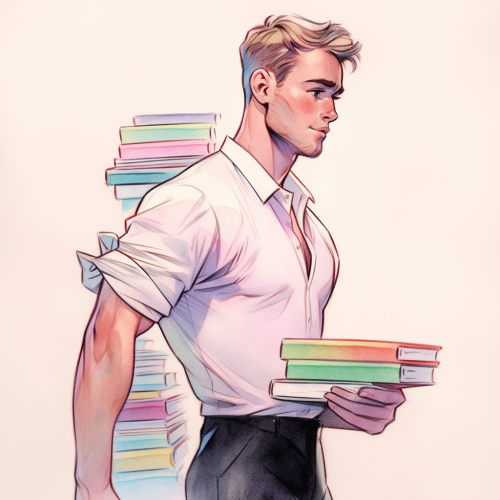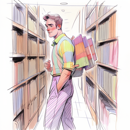 ?️?, rough colored pencils sketch, gay male college professor in the school library, he's carrying a few books, inspired by willem dafoe and tom daley and richard madden, style of zach lynch, wally wood, jc leyendecker, leonid afremov --niji 5 --style scenic