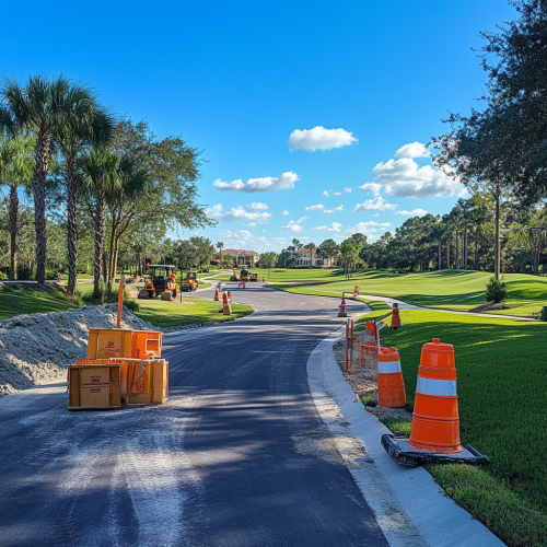 a cart path along a beautiful golf course in the villages Florida. The cart path has road closed signs and is under construction with construction crew