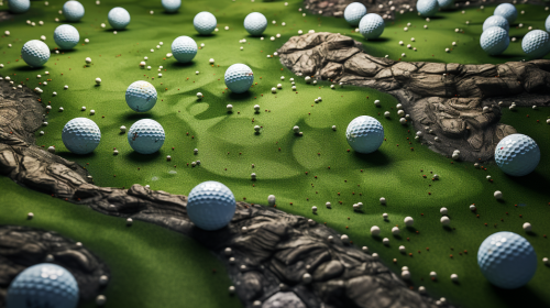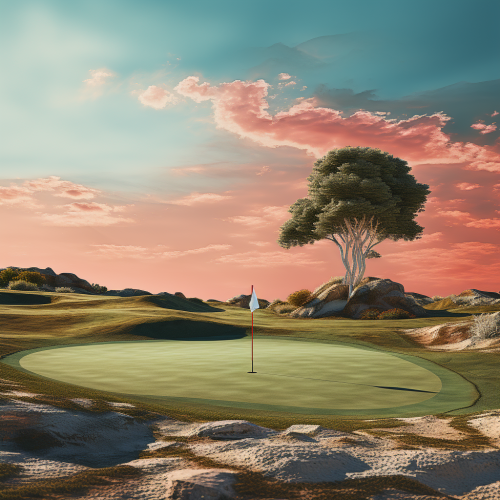 A surreal landscape of a lush green golf course. The scene features rolling green hills, perfectly manicured fairways, and vibrant trees under a clear blue sky. The grass is unnaturally vibrant and glowing, with abstract, dreamlike elements such as floating islands or exaggerated curves in the landscape. The lighting is soft and ethereal, creating a magical, otherworldly atmosphere, with a mix of natural beauty and surreal artistic details. --v 6.1 --s 250