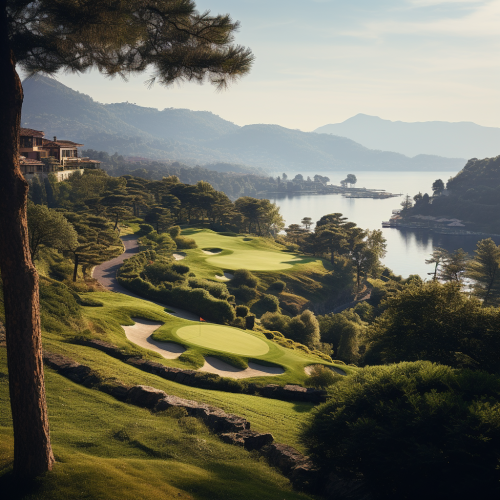 A golf course overlooking Lake Como in the style of Shinnecock Hills running along the coast into the distance. Shot at golden hour with a light fog. Italian Influenced Colourful Gardens, Joyful Celebration of Nature. Emphasisers: GreenCore, Depth of Field Camera: Shot on a Hasselblad medium format camera. Carl Zeiss Distagon t* 15 mm f/ 2. 8 ze, Ricoh r1 --s 250