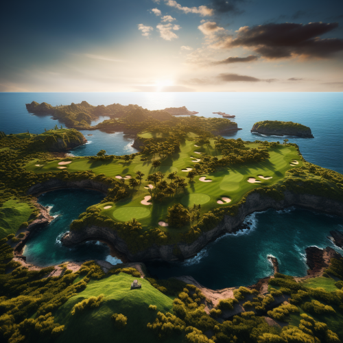 hyper realistic aerial image of a majestic golf course on a small island with cliffs and full of exotic beautiful trees. Stunning landscape of other mountain islands in the distance and the sun setting.