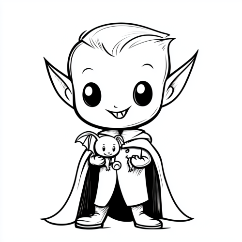 A simple line art coloring page showing a cute vampire holding a small bat. The vampire has a friendly face with a wide grin and small fangs, and wears a cape with a high collar. The bat is tiny and has simple wings, and the vampire is holding it gently in one hand. The illustration is minimalistic, with thick black lines and no background details, making it easy for kids to color.