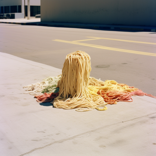 a noodles abandoned by james lee byars, pale colorful PARKING LOT, photographed by luigi ghirri , moving blurry shadows, contemporary art photography. Photographed on medium format Kodak Portra 800 film SMC Takumar 105mm f/2.8 c 50 --v 5.1