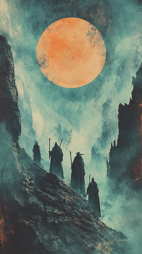 Low resolution screengrab of 1950's Super panavision 70 movie. Retro in colour. A close up of two wizards walking across mountains under a magical sunset. Set in a mystical, dark fantasy world --ar 16:9