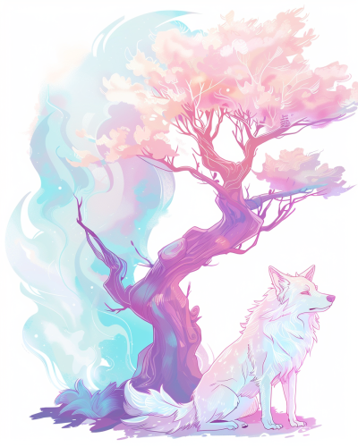 lofi style, Fenrir and Yggdrasil, pastel colors, whimsical, cute, simple, clean lines, black lowlights --ar 4:5