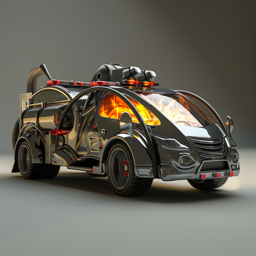 A futuristic fire truck inspired by a Formula 1 car, featuring a slim, sleek, aerodynamic design with sharp, angular lines and a low profile. It has a metallic, polished finish, integrated sirens and lights, and large, streamlined wheels. It has a hose for shooting fire, similar to a flame thrower. --v 6.0