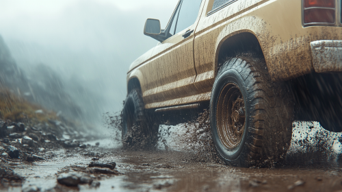 Create an ultra-realistic close-up shot of the front wheel of a beige Ford pickup truck as it splashes through puddles and mud on a foggy mountain road. The rugged tire, covered in dirt and mud, presses into the soft ground, causing muddy water to spray outward with each rotation. Drops of water and mud fly up around the wheel, capturing the gritty, intense nature of the journey. A thick fog surrounds the vehicle, creating a hazy, mysterious atmosphere with limited visibility. The fog blurs the rocky terrain and scattered stones along the path, adding to the sense of isolation and difficulty. The muted, diffused light from the overcast sky casts subtle reflections on the muddy surface, emphasizing the tire’s textured tread and the rough, wet road. The wheel’s movement through the puddles and mud captures the ruggedness of the journey, with fine details like splashes, wet stones, and fog contributing to the scene’s immersive realism. --ar 16:9