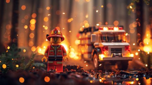 lego character, LEGO minifigure, realistic, 4K, fire rescue team in fire in lego forest, lego fire truck, firemans, --ar 16:9
