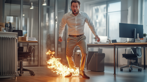 A realistic, humorous photograph of a man in a modern, brightly lit office whose pants have caught on fire because his classic radiator on wheels is also on fire. The man looks surprised and panicked, attempting to put out the flames on his trousers. The office setting includes sleek, modern desks, a computer, glass partitions, and minimalistic decor with plenty of natural light streaming through large windows. The classic radiator with metal fins is visibly sparking and emitting smoke, placed close to a pile of documents and a small trash can, adding a touch of chaos to the otherwise clean and stylish environment. The humor is subtle, with exaggerated expressions on the man's face, yet the scene remains highly detailed and realistic, with excellent lighting and textures --ar 16:9