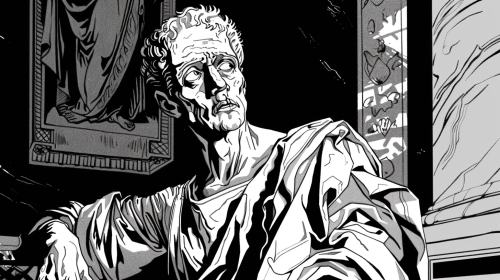 Create a black-and-white line drawing in the style of a classical scene from Hamlet. Hamlet stands in quiet contemplation, his face etched with hesitation and inner conflict. His expression reflects the weight of indecision, as he muses on how the fear of the unknown after death makes people endure the familiar burdens of life. His body language is tense, his posture suggesting the heavy toll this indecision has taken on him. The background is abstract, with faint, dark images symbolizing both the uncertainties of the afterlife and the hardships of the present world, creating a contrast between the two. The atmosphere is one of deep internal struggle, as Hamlet is caught between the fear of death and the suffering of life. --ar 16:9 --v 6.0