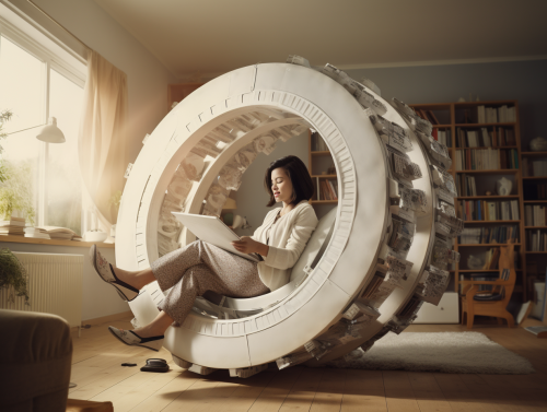 woman struggling on a giant hamster wheel in a living room --ar 12:9