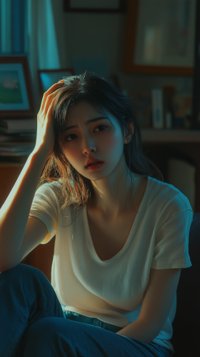 "A young man sitting at a desk, showing clear signs of brain fog. Their expression is dazed and slightly confused, with furrowed brows and half-closed, tired eyes that appear unfocused, staring blankly ahead. They have dark circles under their eyes, suggesting fatigue or lack of sleep. One hand is placed on their forehead, as if trying to concentrate or remember something, while the other hand rests on an open book or laptop keyboard. Their posture is slouched, shoulders slightly hunched forward, indicating low energy or mental exhaustion. The background is softly blurred, emphasizing a sense of mental haze and difficulty concentrating. A dimly lit room with scattered papers, a cup of cold coffee, and a clock showing late hours adds to the feeling of mental fogginess and struggle.