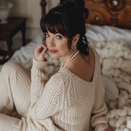 a brunette 35 yo plus size woman, getting ready to sleep. Ponytail, bangs and pearls. She is wearing a soft knit cream outfit. --v 6.0