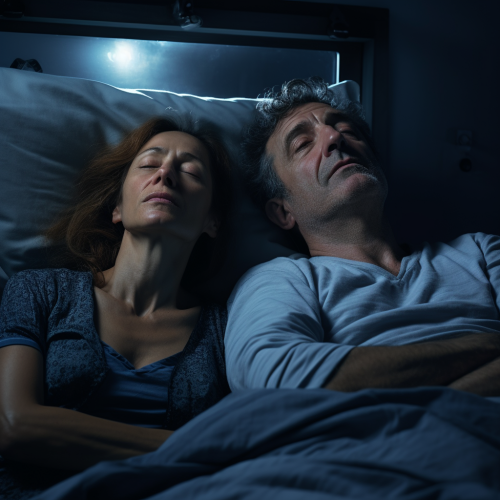 COUPLE MAN AND WOMAN 55 YEARS OLD IN A BED WHERE THE WOMAN IS AWAKE LOOKING AT THE MAN SNORING NIGHT LIGHTING 8K