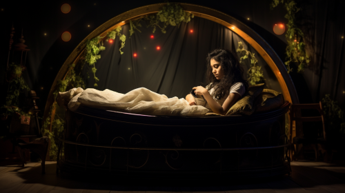 a round cream tub in the shape of a bed, the cream layer is the bedsheet, a woman in her early twenties with black hair, sleeping under the bedsheet, in a dimlit room, professional photography, Nikon D850, F/2.5 --ar 16:9