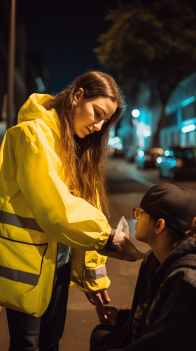 Woman with yellow reflection jacket helping a young person with a blue shirt that's sleeping in the street. Night time. --ar 9:16 --v 5.0
