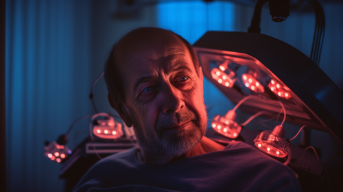 a close on a face of a man giving interview, in a room full of medical sleep devices, with shinning red lights, shot with leica 50mm, photorealistic style --ar 16:9 --v 5.1