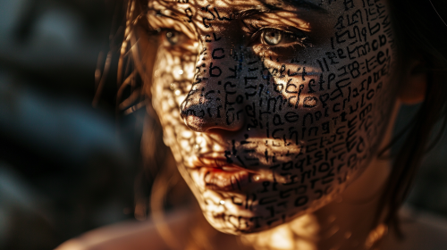 /BLINDING LIGHT, the face of a woman is covered in letters, in the style of body art , dark white, stark contrast of light and shadow, sun hating by lights, in the style of double exposure --ar 16:9 --v 6.0 --style raw