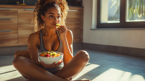 A photo of a sporty Brazilian woman, medium brown skin, athletic build, eating a bowl of healthy muesli with fresh fruits, sitting casually on the floor in a cozy modern kitchen at home. The background features minimalist decor, wooden cabinets, and warm morning light streaming in from a window. Soft shadows accentuate her relaxed posture, while the light highlights the vibrant colors of the fruits in her bowl. Natural lighting, soft shadows, hd quality, photorealistic details, cozy vibe, Canon EOS camera, slight depth of field --ar 16:9 --v 6.1