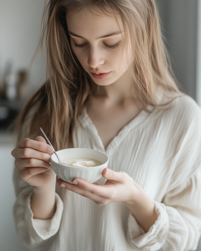 Medium shot of a woman with a minimalist background, holding a small dessert in a white porcelain dish, eating with a tiny spoon, set in a bright, modern kitchen with smooth surfaces and soft pastel tones, clean background trending, shot with a Leica Q2, 28mm lens, bright natural light, soft shadows, minimal color palette --ar 4:5 --style raw