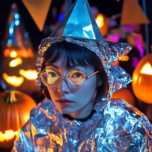 a woman at a halloween party, she wears a futuristic costume made of aluminum foil. she wears glasses with triangular lenses (tips pointing upwards). her hat has a pyramid shape. the light is semi-dark and you can see glowing pumpkins in the background.