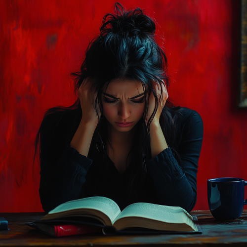 A photo of a beautiful woman holding her head in despair. She is sitting at a desk with an open book and a coffee cup on the table. books on her table, as well a dark blue mug. She has long black hair pulled back into a tight ponytail. The background color should be red. --s 250