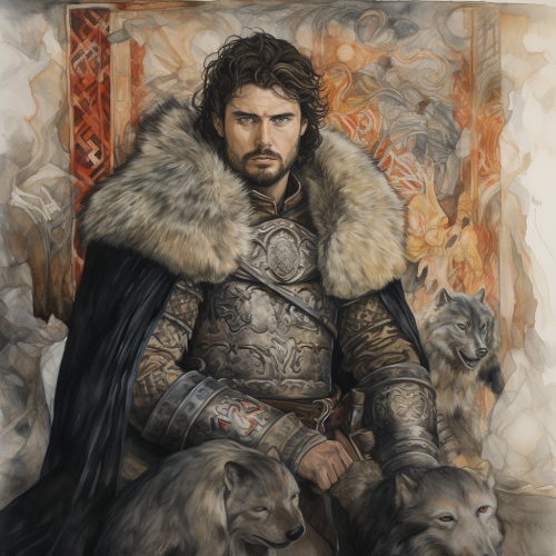 illustration, brush painting, young king in the north from game of thrones, short black hair and short scraggly beard, grey eyes, gaunt appearance, wearing leather brigandine armour and a fur pelt cloak over chainmail, standing infront of a medieval tapestry