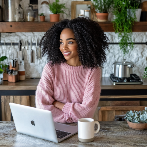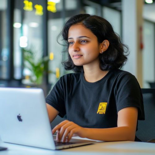 A focused young Indian female student, around 25 years old, sitting at a desk with a laptop, wearing casual attire (a plain t-shirt and jeans), with a slightly curious and confident expression as if discovering something new. His facial expression should convey excitement about learning AI for growth hacking. Short, dark hair, light stubble, and a modern, urban appearance. The background should show a blend of a tech-centric environment-- floating data visualizations or subtle digital elements, giving an impression of artificial intelligence. Keep the scene dynamic with a modern interior--like a co-working space or startup office.