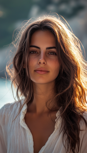 portrait of a beautiful italian woman in the Amalfi Coast, clear facial features, cinematic, 35mm lens, f/1.8, accent lighting, global ilumination --q 2 --ar 4:7