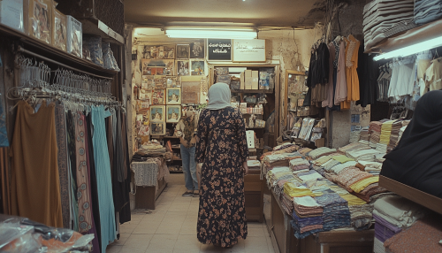 a woman, poor middle eastern clothing shop, in the 2000s , wide shot, cinematic shot, well lit faces , soft color palette, high key lighting --ar 7:4 --v 6.1