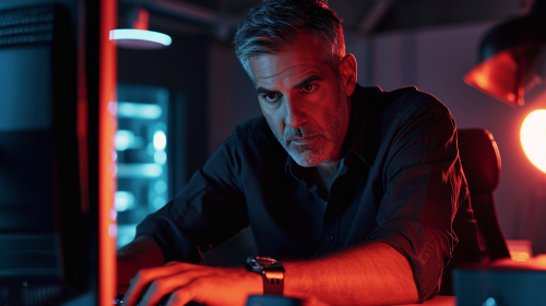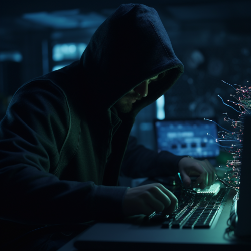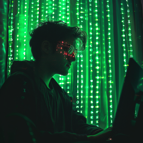 hacker sitting near a computer, in the background like in the matrix zeros and ones from top to bottom in a stream, view from the side, darknet