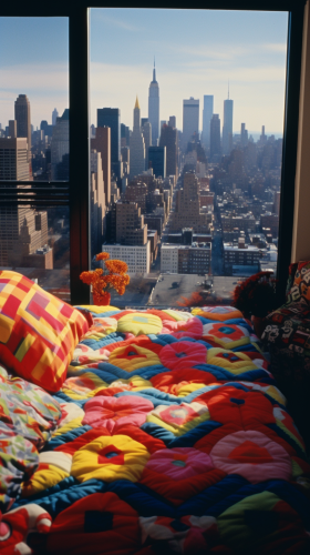 an 80s photograph of a bold, colorful, small NYC apartment, bedroom, wide angle shot, with a view of the city from the window in the style of grainy photography, 1980s interior design trends, 1980s: :3, --ar 9:16 --style raw --s 50