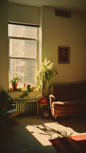 an 80s photograph of a bold, colorful, small NYC apartment, in the style of 1980s interior design trends --ar 9:16 --style raw --s 50