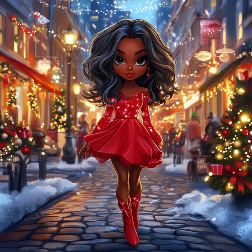 hyper realistic illustration of a chibi style melanin woman in a neon red dress, stone boots with shoulder length wavy hair. Long red nails walking down a cobble stone road at Christmas time, the stree is light up with Christmas lights and beautiful neon decorations