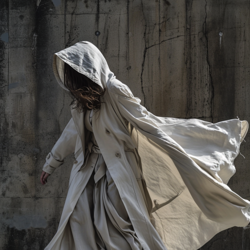 realistic high quality photo of a boy with dark short curly hair, wearing a cap, he is wearing a beige trenchcoat, he is looking at a girl sitting besides a her, the girl has long orange-blond hair, headphones, and a band black shirt, she is looking away. light Grey color palette, with a vintage film camera feel, soft light, serene and nostalgic mood --sref 1109890837 --style raw --ar 3:2 --v 6.0 --s 250