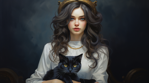 beautiful woman in a doctors dress wearing glasses and a crown, a cat sitting on her shoulder --ar 16:9