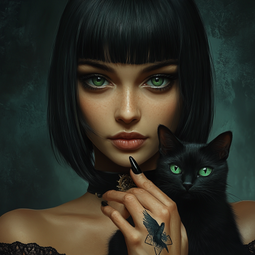 Create a stunningly beautiful witch-priestess with captivating green eyes. She has a sleek black bob hairstyle with a middle part, and her straight black hair reaches just to her shoulders. In her hands, she holds a black cat. Her long, elegant fingers are adorned with beautifully manicured nails. Her left wrist features a delicate tattoo of a phoenix designed like a bracelet. The image should emphasize her mystical and graceful appearance.