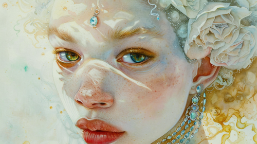 fine art ultra-hyper-realistic dynamic opulent masterpiece closeup portrait watercolor painting by Ali Cavanaugh of an incredibly gorgeous pure albino Nigerian porcelain fembot priestess, she is slathered in raw gardenia honey and multicolored diamonds, magnificently haunted pagan temple backdrop, bright loop lighting, superb bokeh --ar 16:9