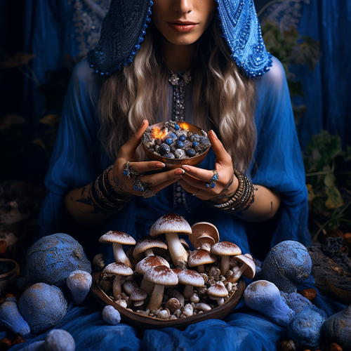portrait of a mature woman in her 30s who is a priestess of the sea. Blonde with dyed blue streaks in her hair. Maritime amulet. No makeup. Self-confident, arrogant and moody.