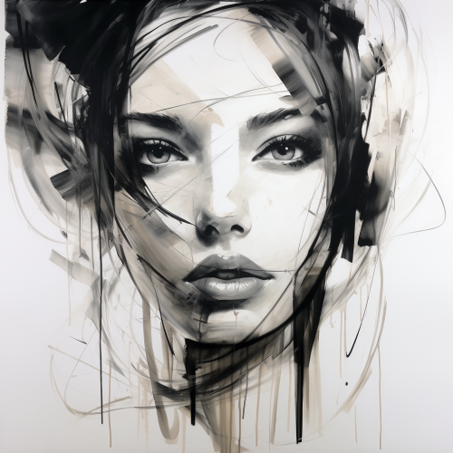 create the woman's drawings are in black and white style, in the style of pared-down abstraction, elegant, emotive faces, hard edge painter, asian-inspired, double lines, made of glass, strip painting