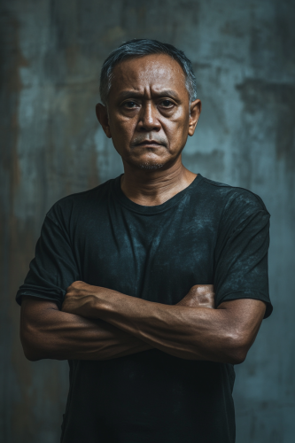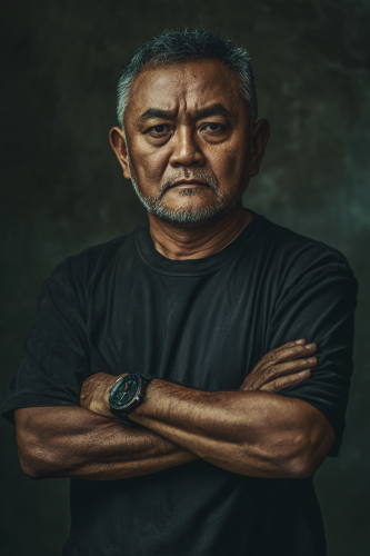 a 60 year old malay man stands aggresively with folded arms, full body shot, he looks badass and serious, focused determined expression, dramatic pose, gritty light muted background --ar 2:3 --v 6.1