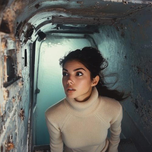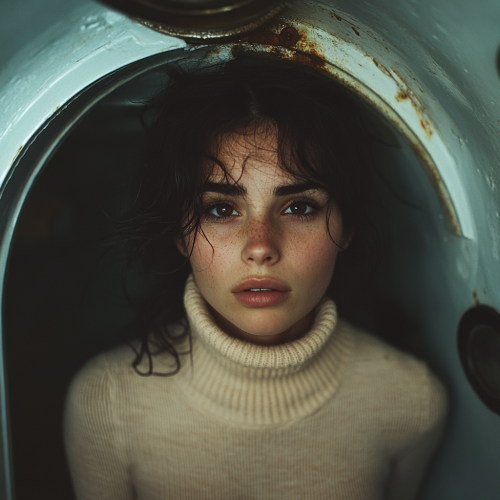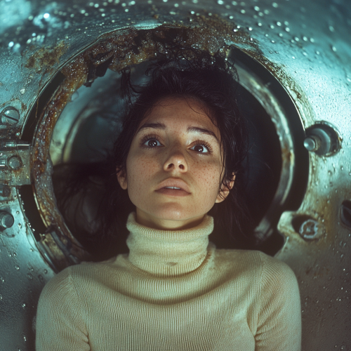 beautiful anxious chilean woman in cream cashmere turtleneck leaving submarine upward via its escape hatch in its upper deck deep under the ocean. The water is murky.