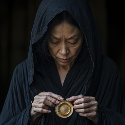 realistic selfie 40y old asian woman prophet in dark, wear old hooded, from left side, cannot see face clearly, attach some hindu golden amulet --c 30 --s 200 --v 6.1