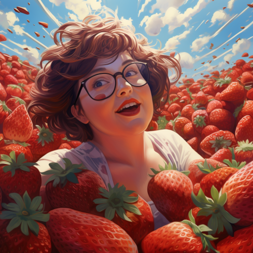Pixar style poster of a beautiful chubby 40 years old woman in the middle of strawberry field