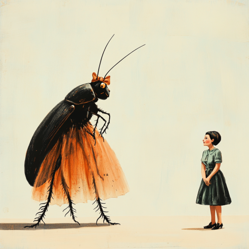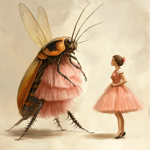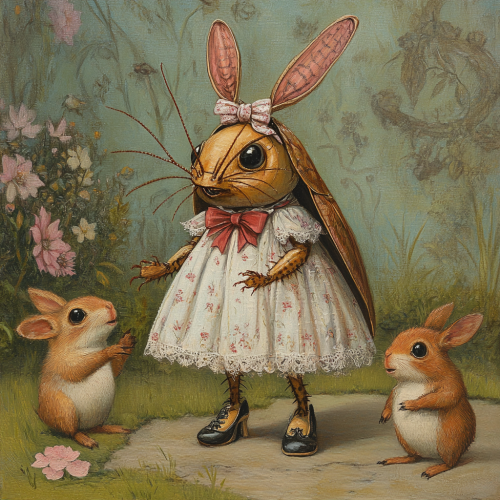 cockroach in a little dress, wearing slippers, very pretty, with a bow in her hair talking to other cute little animals the same size as her for a children's book image
