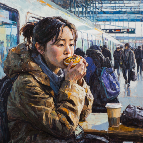 A Korean woman in her 40s was eating a donut and coffee at a cafe in the lobby of Seoul Station. The sky visible through the window was bright blue. I quietly watched as people got off the train that had just arrived and rushed to the exit. They walked briskly, carrying suitcases, thick backpacks, and outerwear that had become heavy due to the suddenly cold weather. - Oil painting illustration