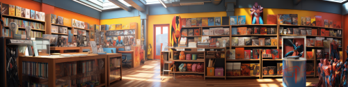panoramic view of a comic book shop, detailed and realistic, colourful, bookshelves all around the shop, sofas in the far left corner at the forefront, superhero statues decor, 3D 360 view, dynamic, 1970's style --ar 8:2 --s 250 --style raw